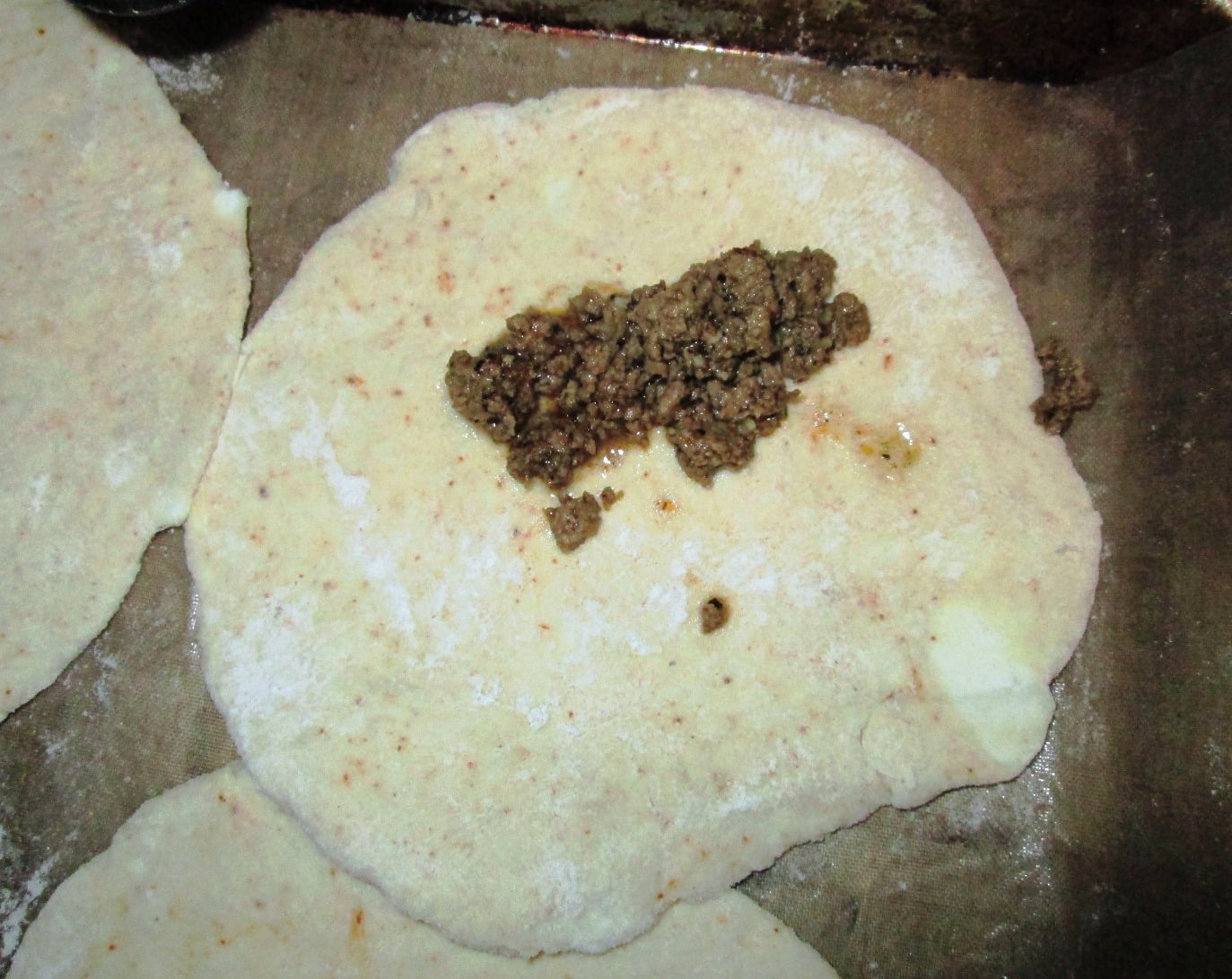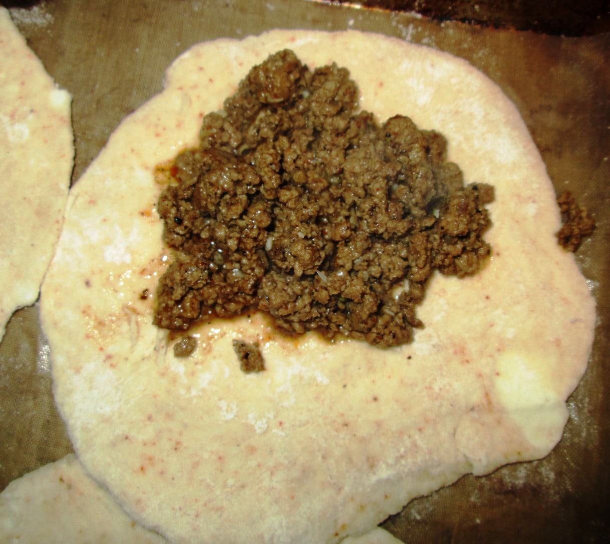 with the pumpkin empanadas, I found that a single measuring teaspoon was not sufficient. Instead, I filled each empanada with about three tablespoons of ground beef. This still didn’t quite use up all the filling.