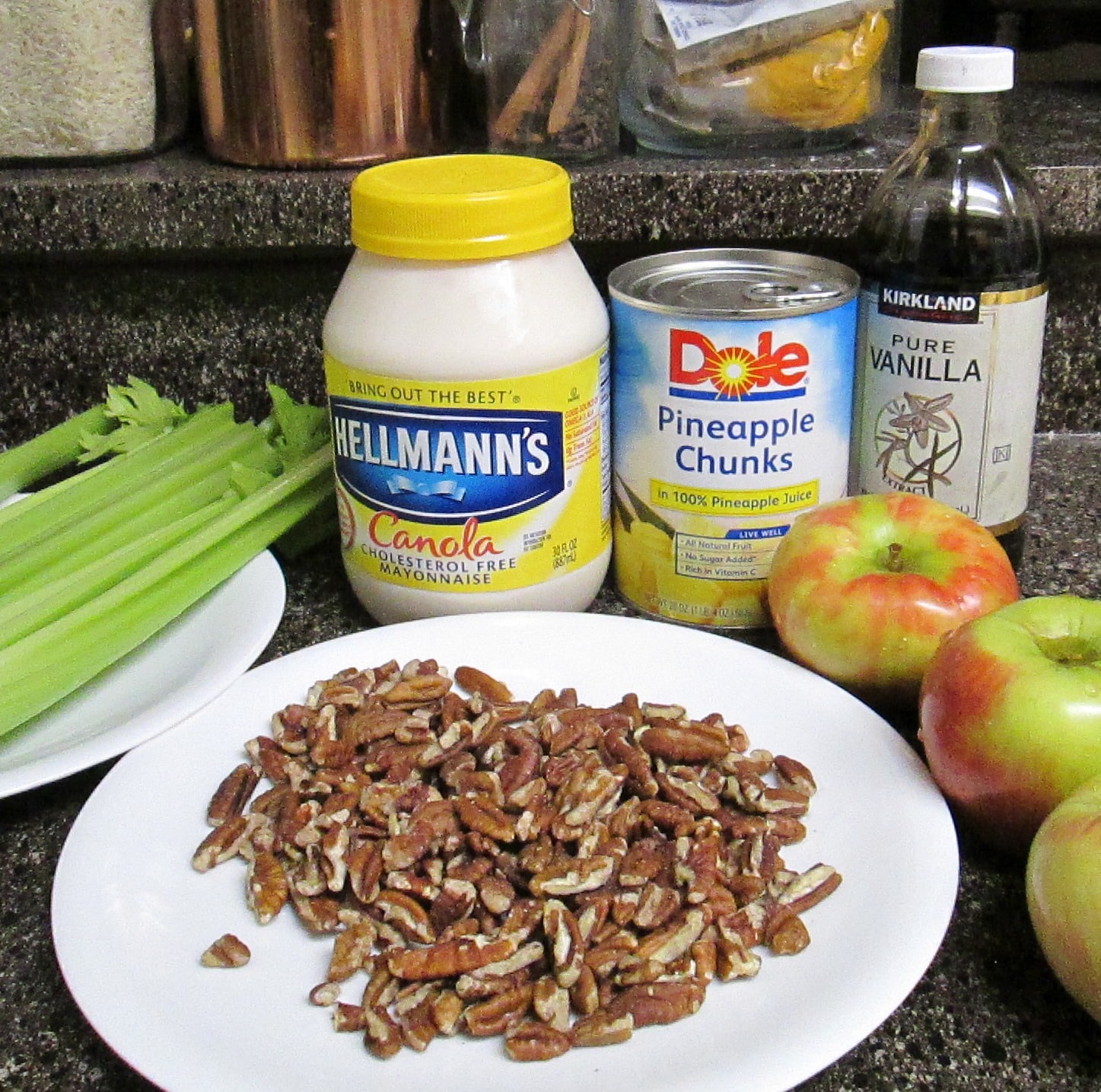 Chop the apples, pineapple, celery (previously cleaned), and pecans. Add mayonnaise and cream. If desired, also add a teaspoon of vanilla.