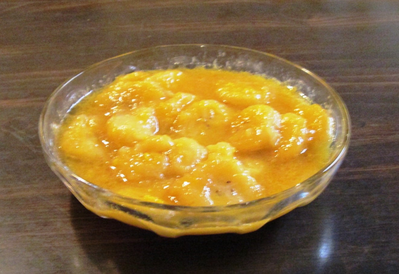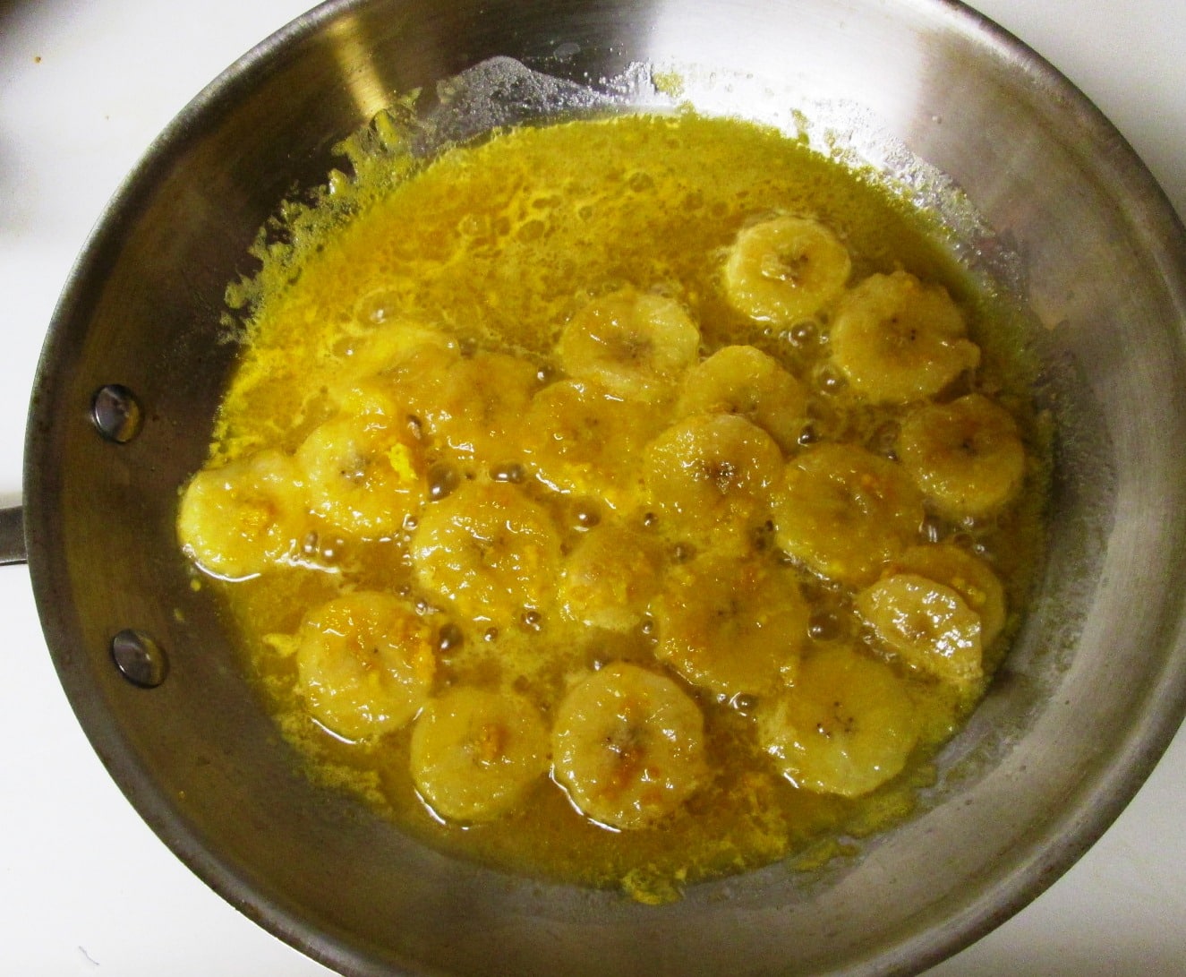 Some readers suggested that I might have better luck with fried bananas, and at last my opportunity to do arose when I found the Wallace’s recipe. Rather than being crisp-fried, these bananas are lightly fried and then simmered in orange juice that reduces to a kind of syrup.