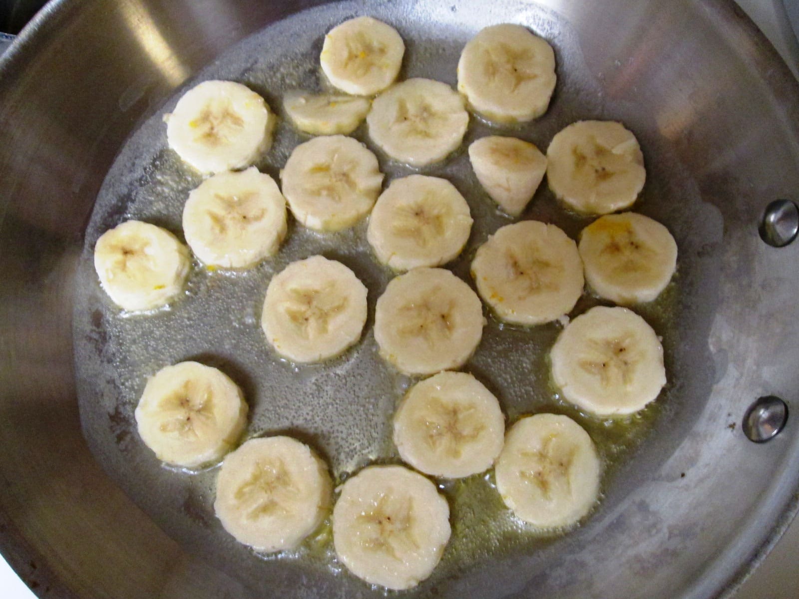 Distracted by other things, I made a major error when preparing this recipe last night. As you can see from the photos, I sliced the bananas cross-wise into rounds instead of length-wise as the recipe dictates.